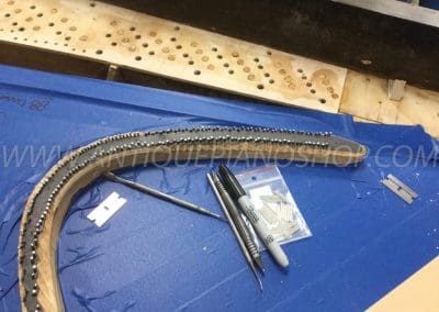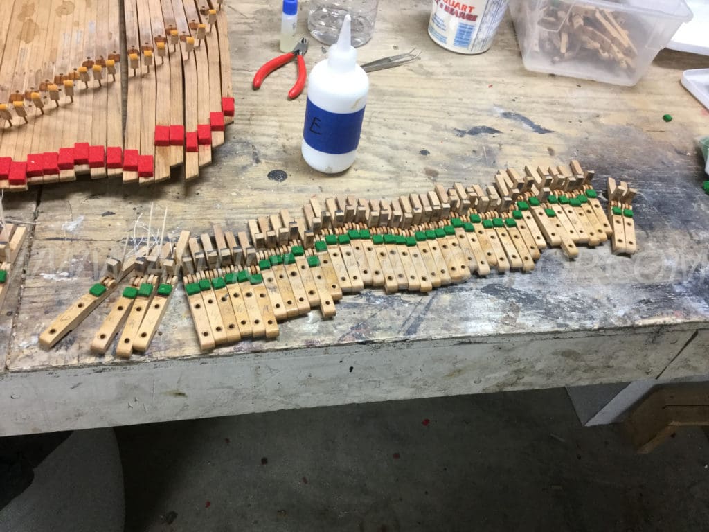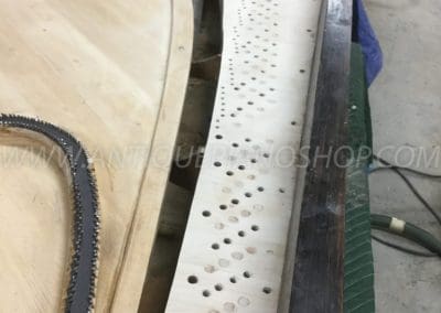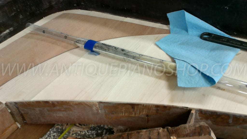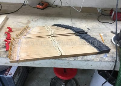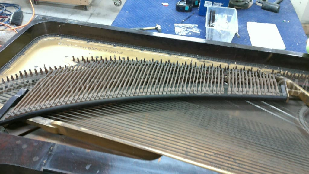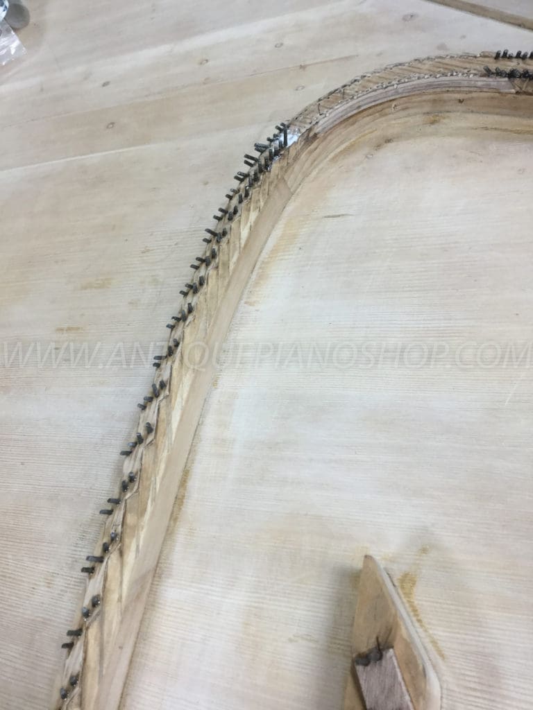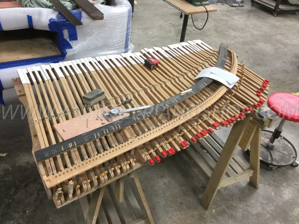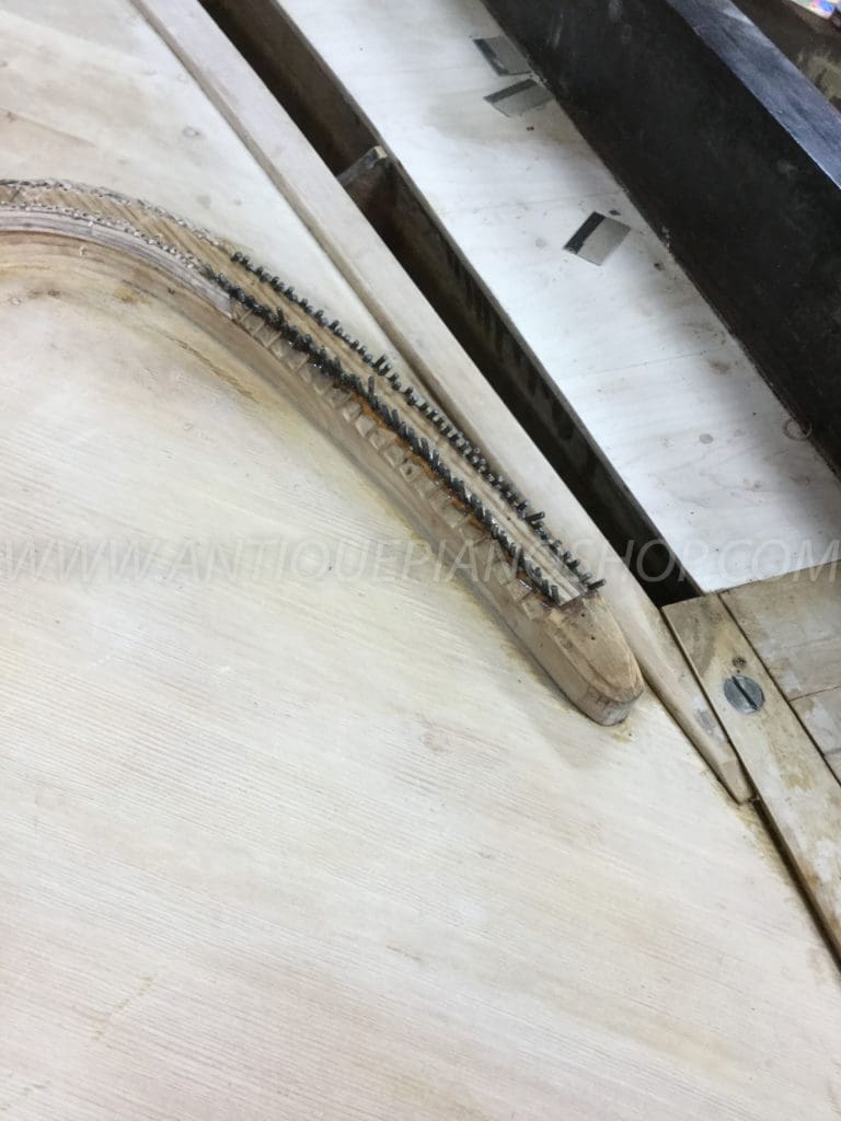The old worn strings are so weak and brittle they are no longer able to be tuned. The strings are removed from the instrument with each individual string painstakingly measured and recorded in order to regenerate an accurate stringing scale. The gold harp is removed from the case exposing the old-growth wood soundboard. Multiple cracks and splits in the soundboard are repaired and the bridges are repaired and partially re-capped where needed. Thread is used to mimic the strings as the proper amount of down-bearing is achieved.