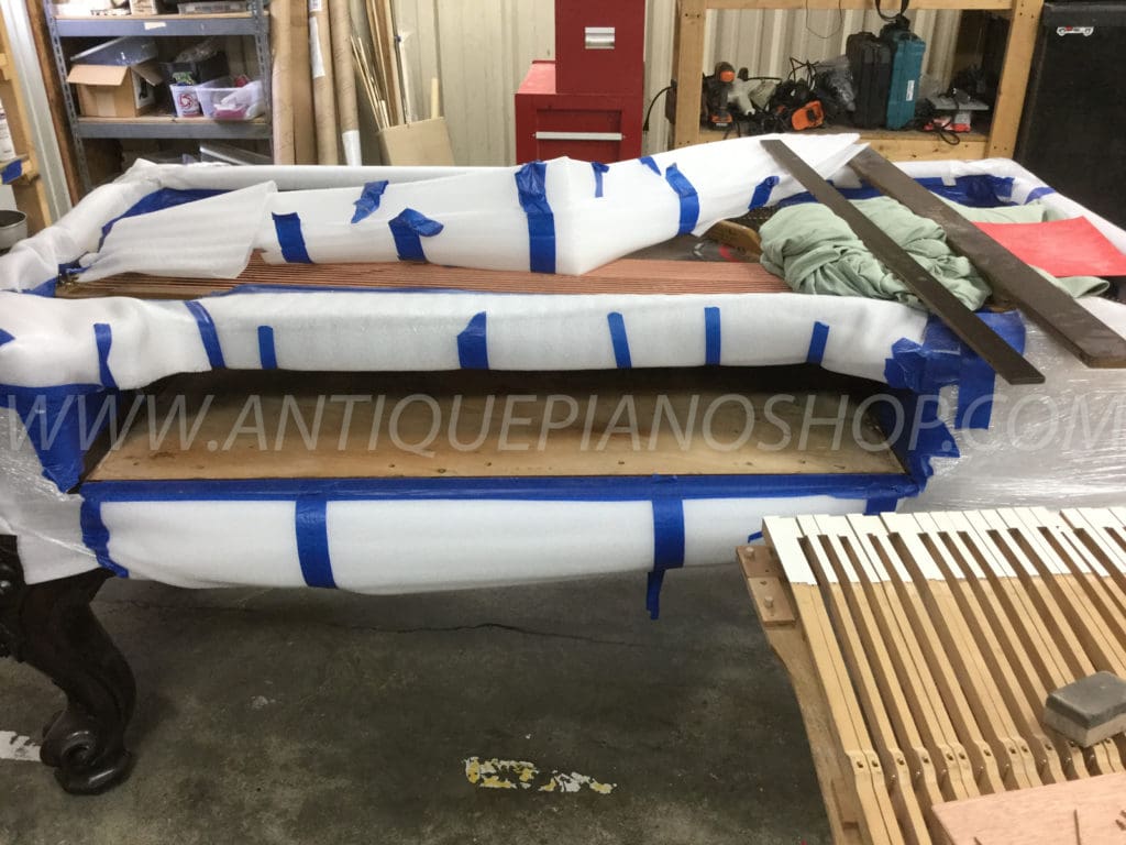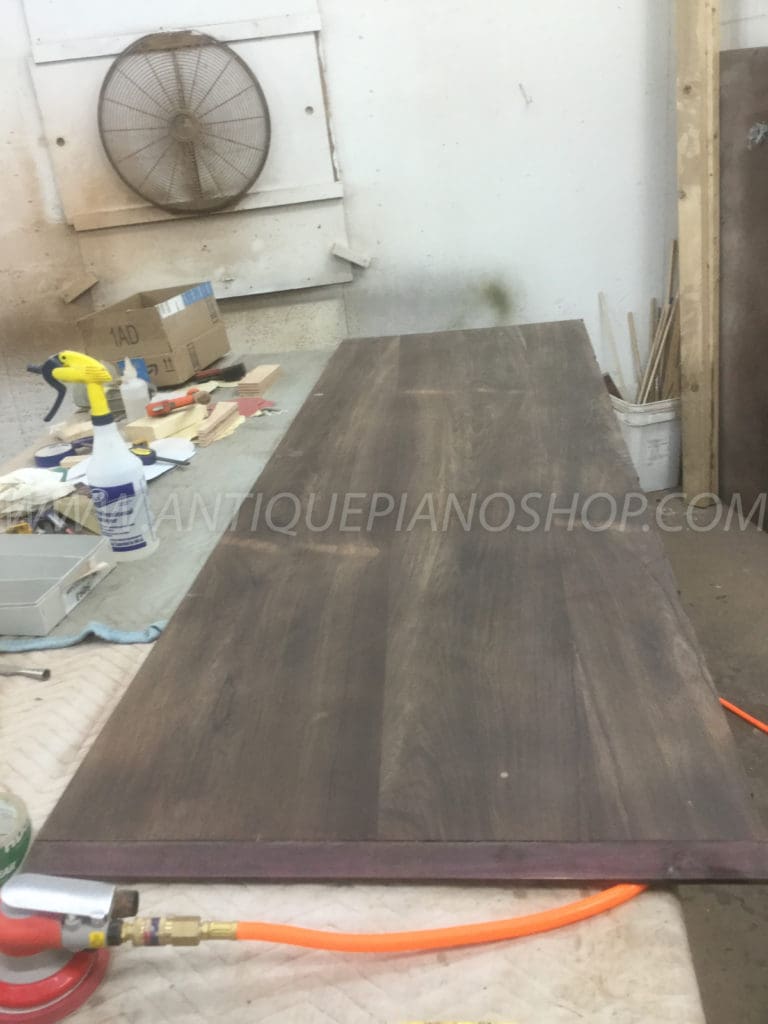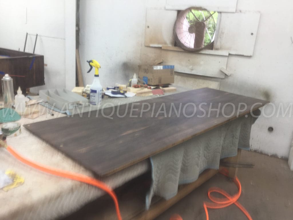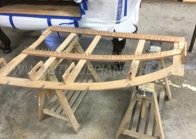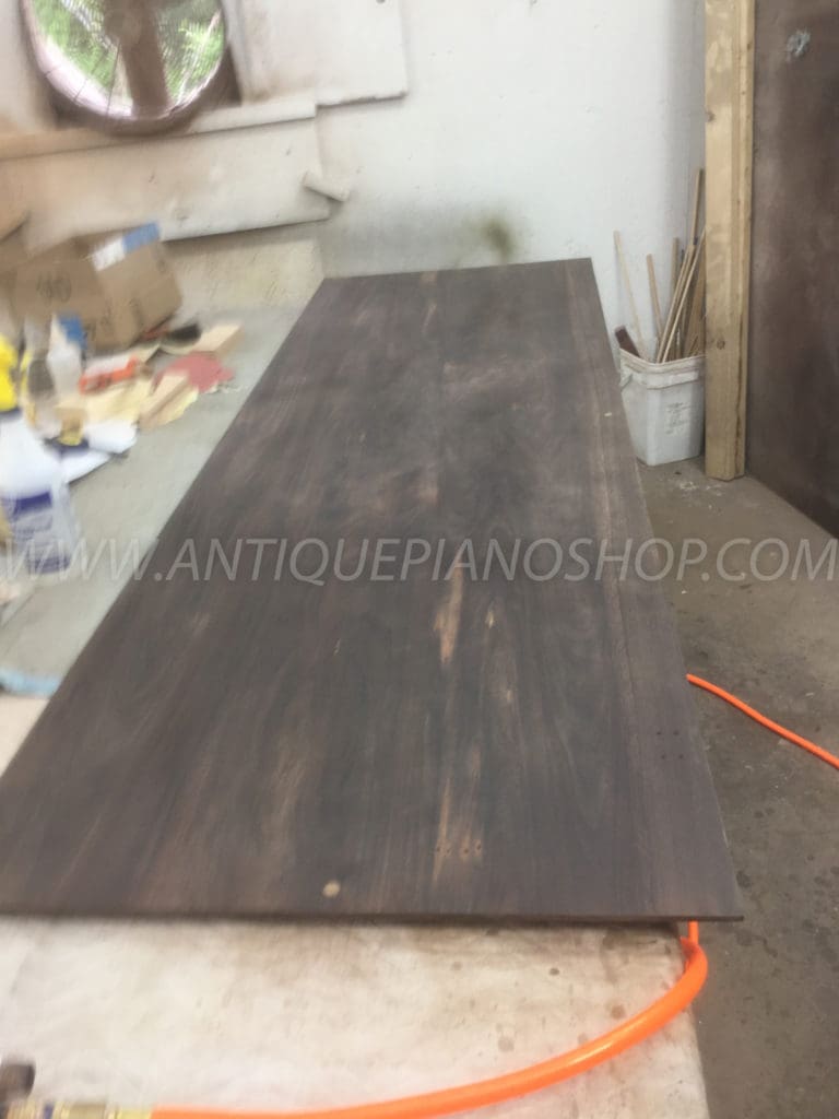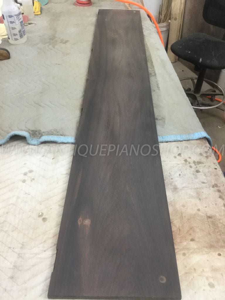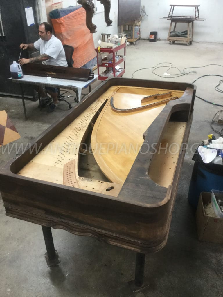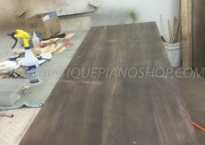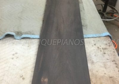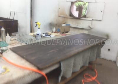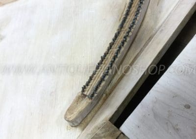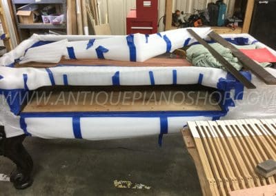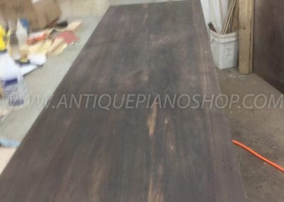The old dark finish is carefully removed from he case and broken and missing pieces are made and repaired. Once the old finish is removed and parts are repaired, every piece of the piano is carefully hand-sanded to ensure a smooth foundation for a perfect finish. Multiple coats of stain, sealer and lacquer is applied, each coat sanded slick, to ensure the finest clarify and lusture of the rosewood finish.