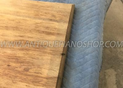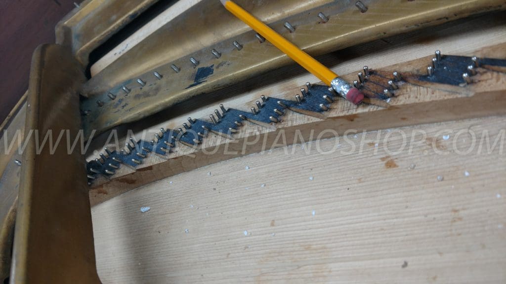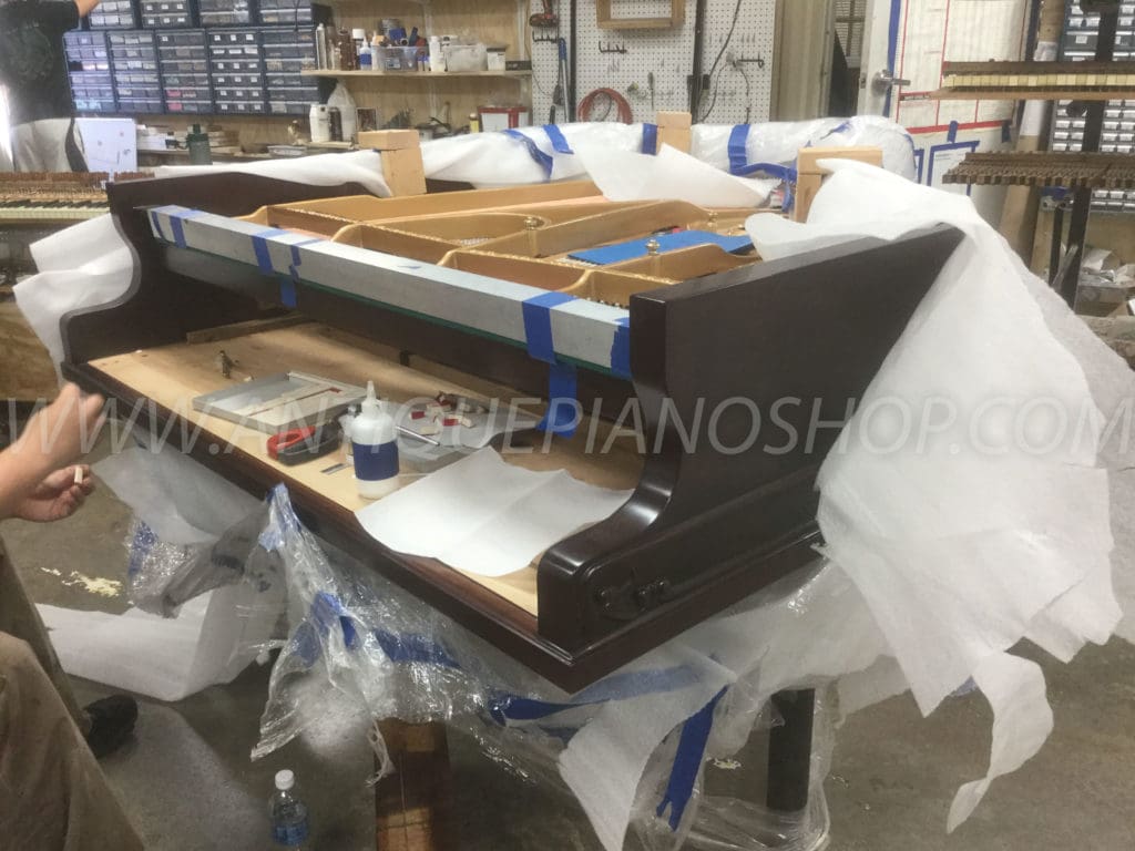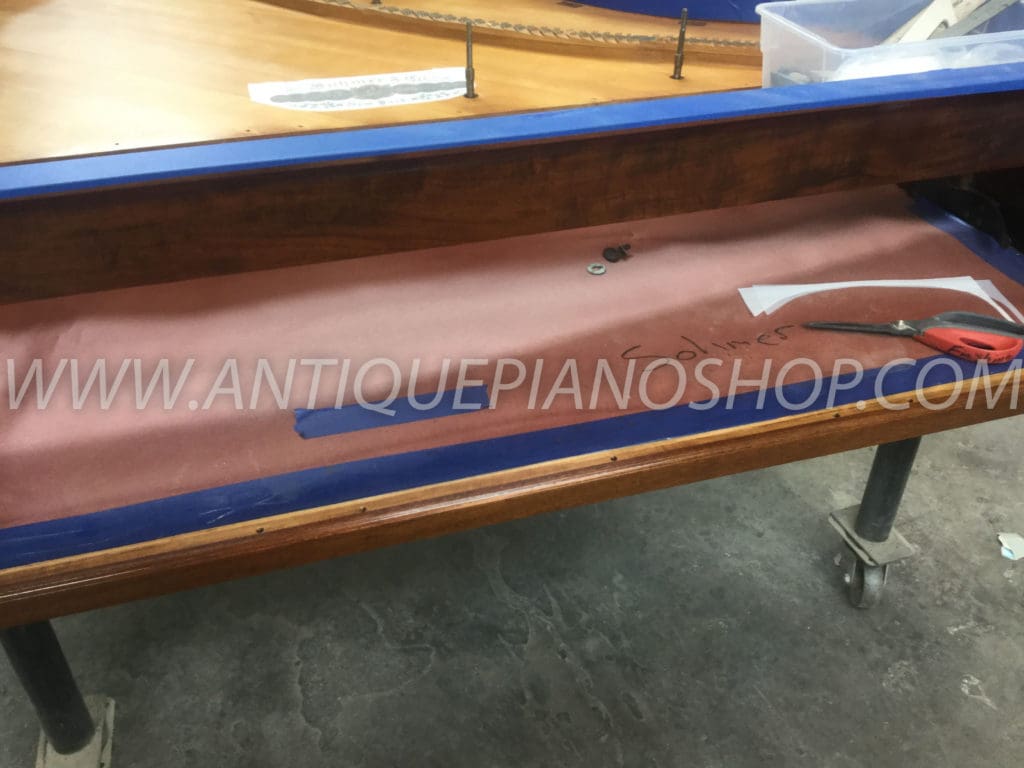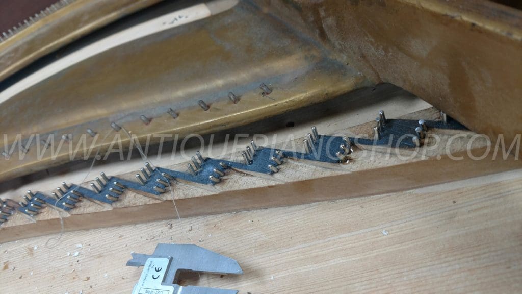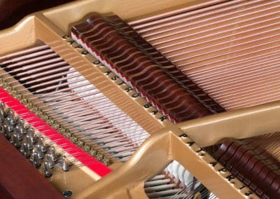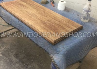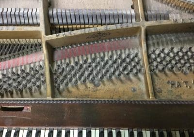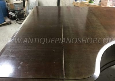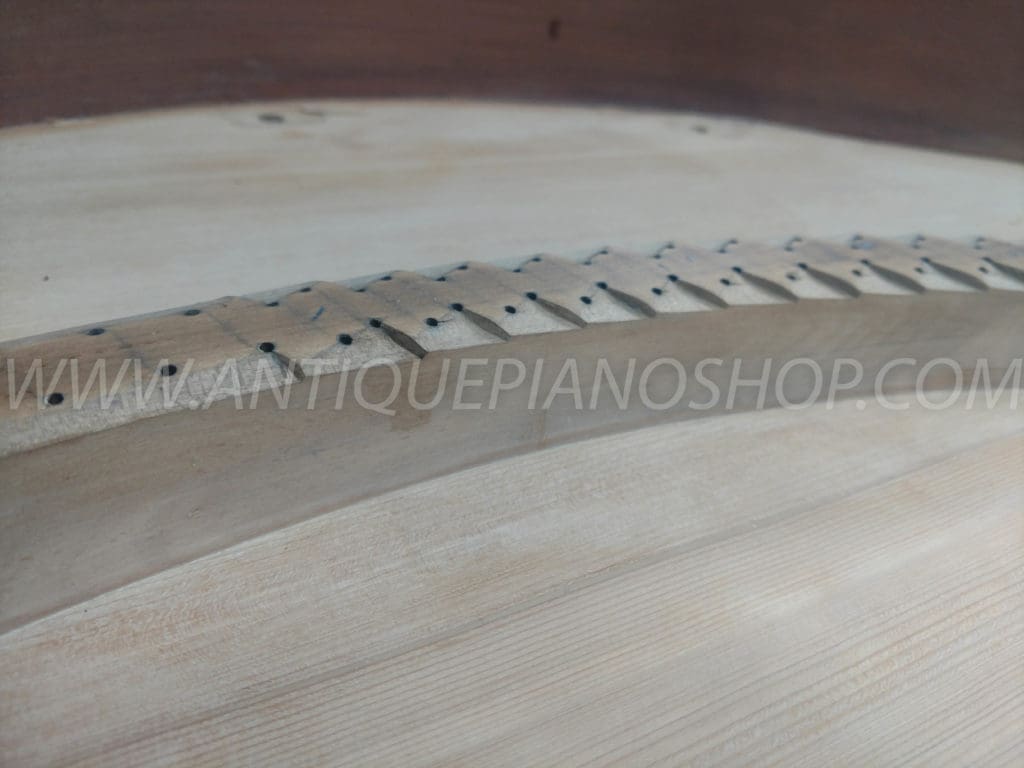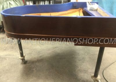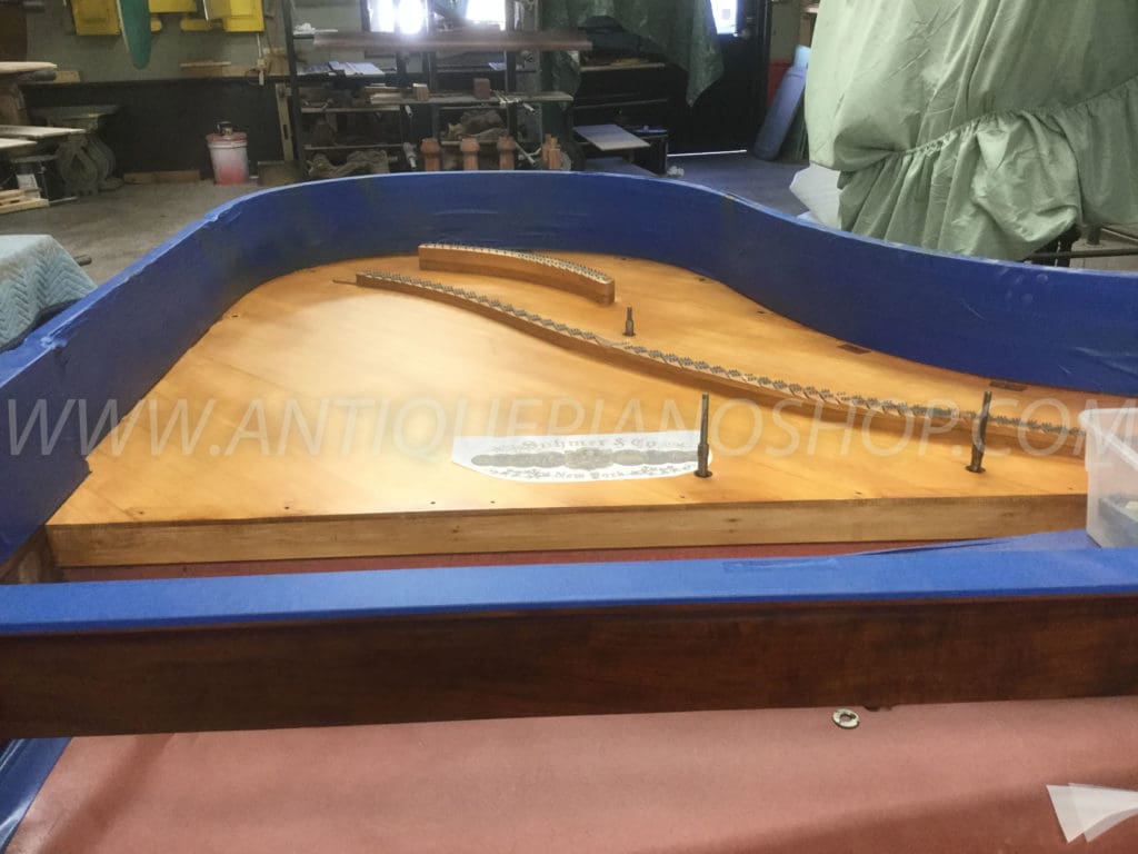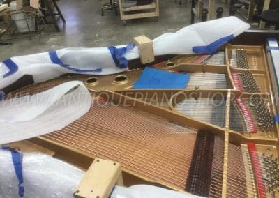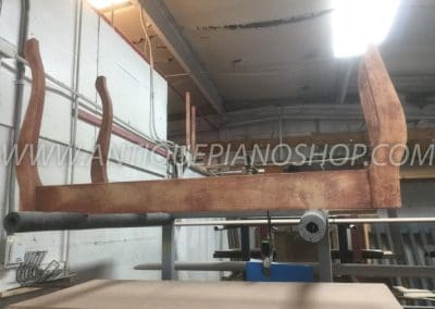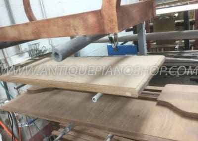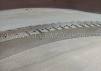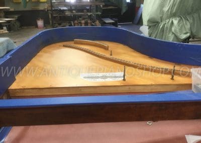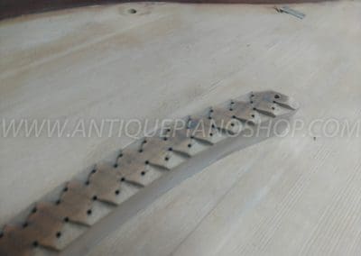 Removing the strings and the harp from the piano allow access to the original Sitka spruce soundboard. Soundboard supports, called ribs, are reattached and prominent cracks are repaired. This part of the process requires a lot of time and patience.