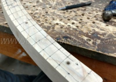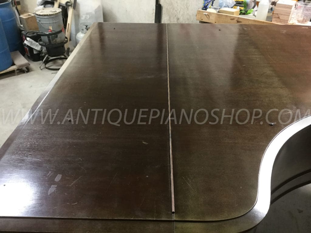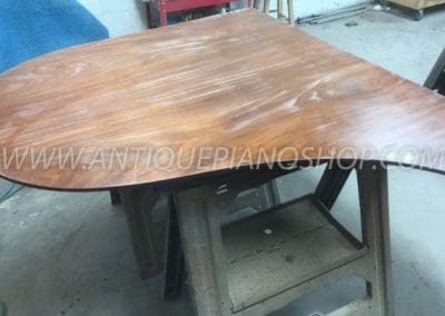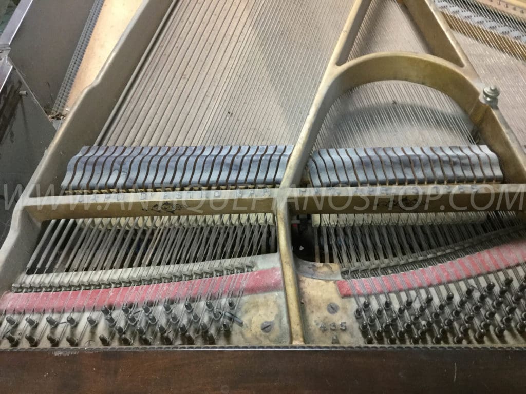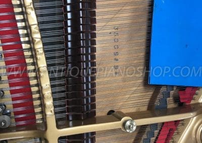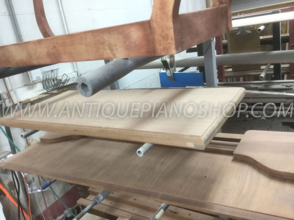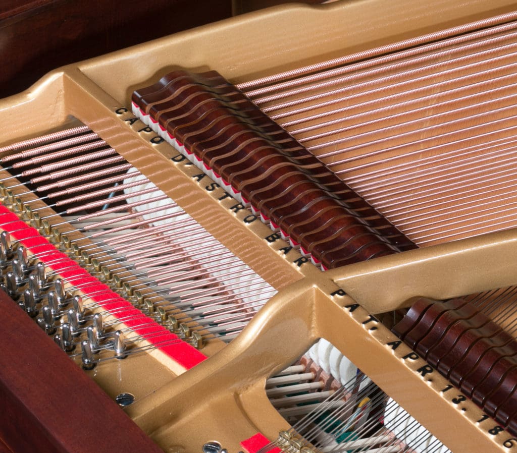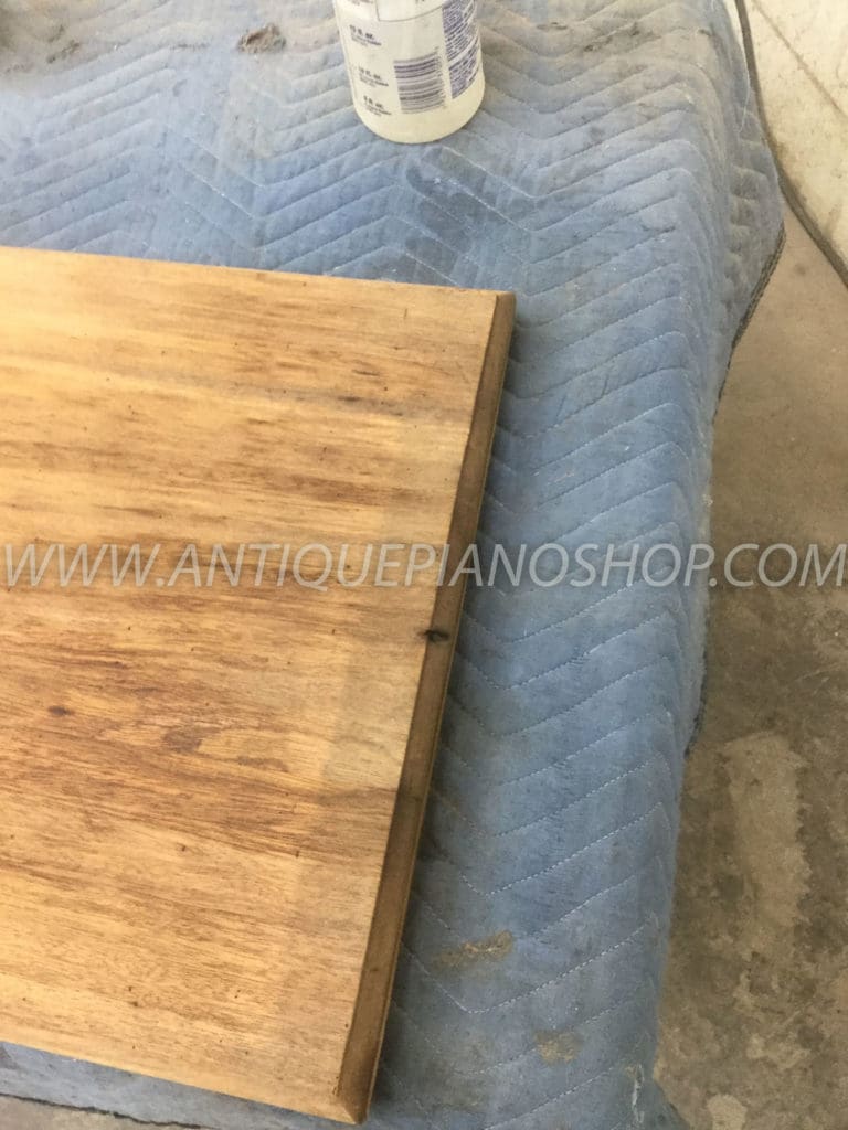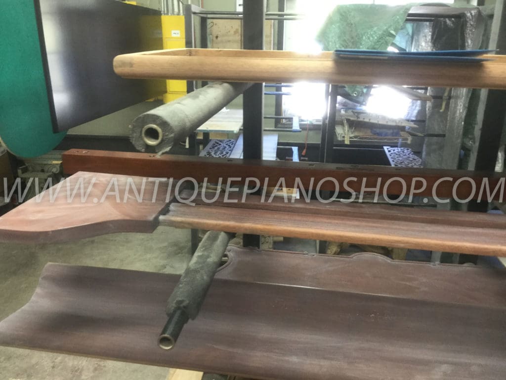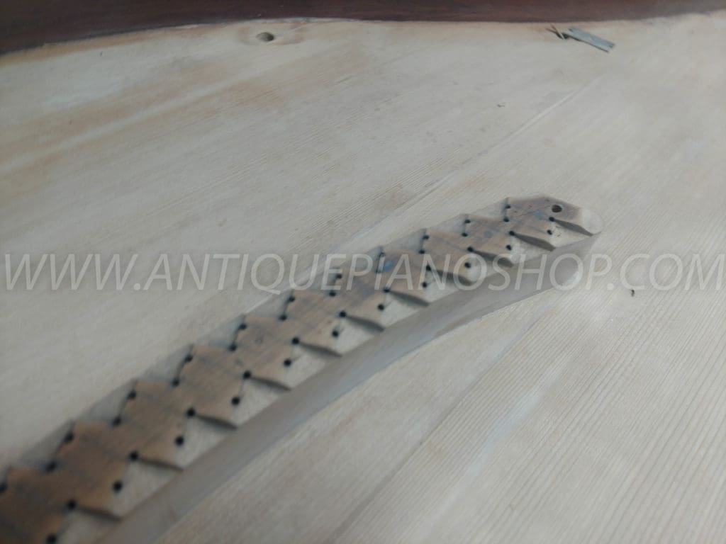 Removing the strings and the harp from the piano allow access to the original Sitka spruce soundboard. Soundboard supports, called ribs, are reattached and prominent cracks are repaired. This part of the process requires a lot of time and patience.