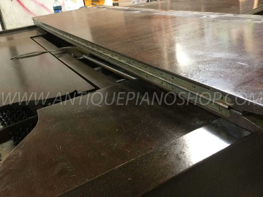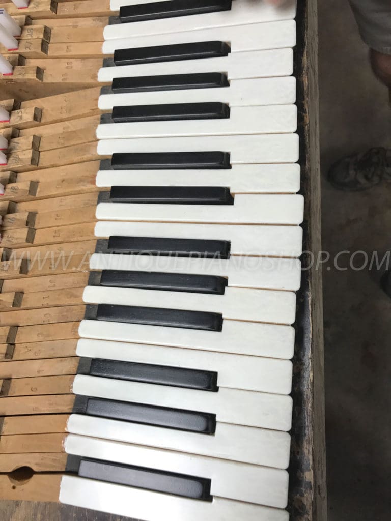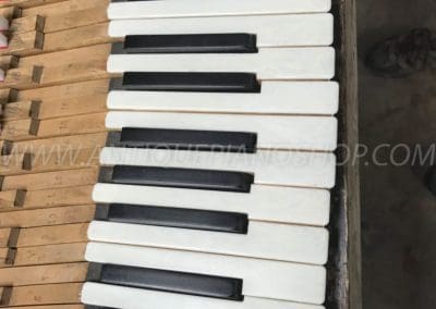 The piano’s original ivory keytops had been replaced with celluloid keytops decades ago. Our technicians carefully replaced these faded, lackluster celluloid keytops with new faux-ivory keytops.