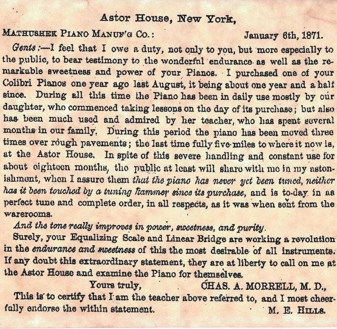 Old-timers tell us the story of how they used to take a wagon with a piano loaded on the back and venture out into the countryside, only to pretend to have a wheel or axle “about to break” in front of a rural farmhouse. As a favor, the farmer’s family would allow the salesman to leave his piano in the home for safe-keeping while the salesmen took the wagon for repair – often over a period of several days. More often than not, the salesman would return to find that the farmer’s daughters had taken a liking to the piano while he was gone! Imagine how many pianos were sold this way, all unbeknownst to the farmer and his wife!