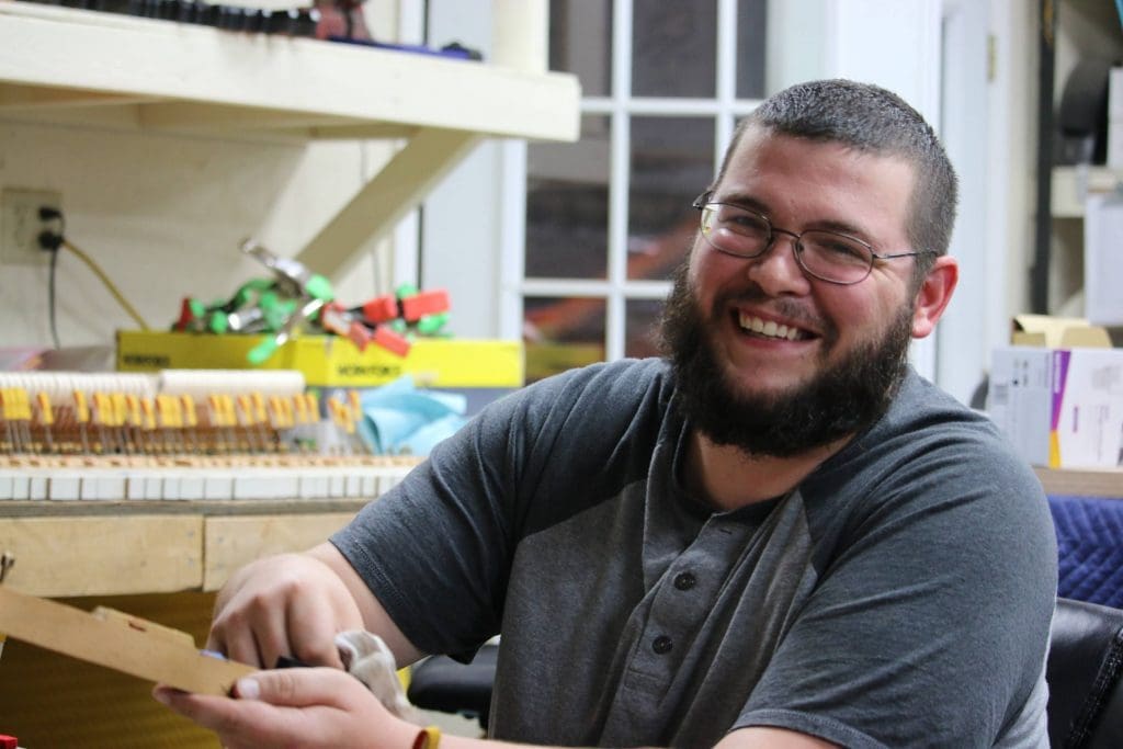 Jacob McIntosh is one of our resident local employees who settled not too far from our shop in a town called Townsend, Tennessee. Jacob went to school and studied history and education, but instead of going into teaching he decided he wanted to pursue a career in art. He prefers oil, water color, and charcoal drawings, but soon realized it would be tough to raise three kids on an artist’s salary! His artistic ability is clearly evident in his work because Jacob has an acute attention to detail and has a tremendous amount of patience. He also loves being able to see pianos that have been neglected or destroyed come back to life and look like they were just built, despite sometimes being more than 100 years old.