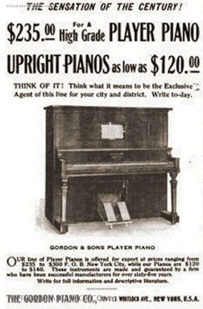 The Gordon & Son Piano Company was originally established in 1845 as “Berry & Gordon” by partners Stephen T. Gordon and Thomas S. Berry in New York City. In 1867 – 1868, Gordon partnered with Moses Slater to form the firm of “Gordon & Slater”. In 1869, Gordon & Slater was dissolved and Stephen T. Gordon started his own firm under the name of “The Gordon Piano Company”.